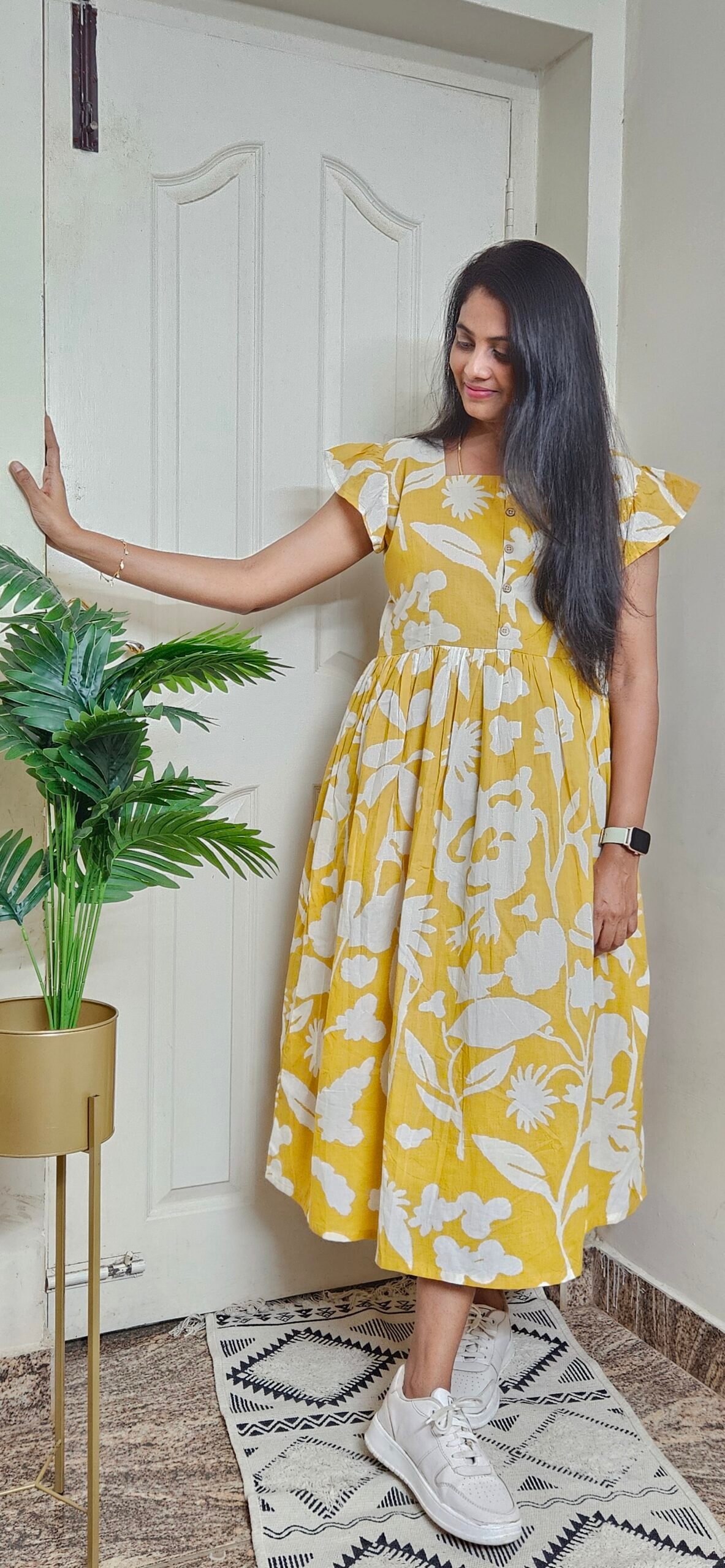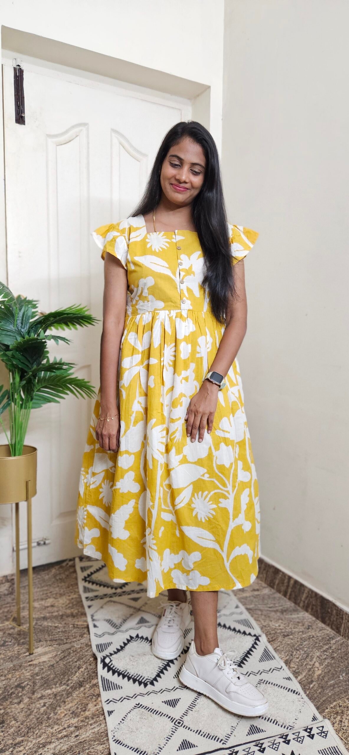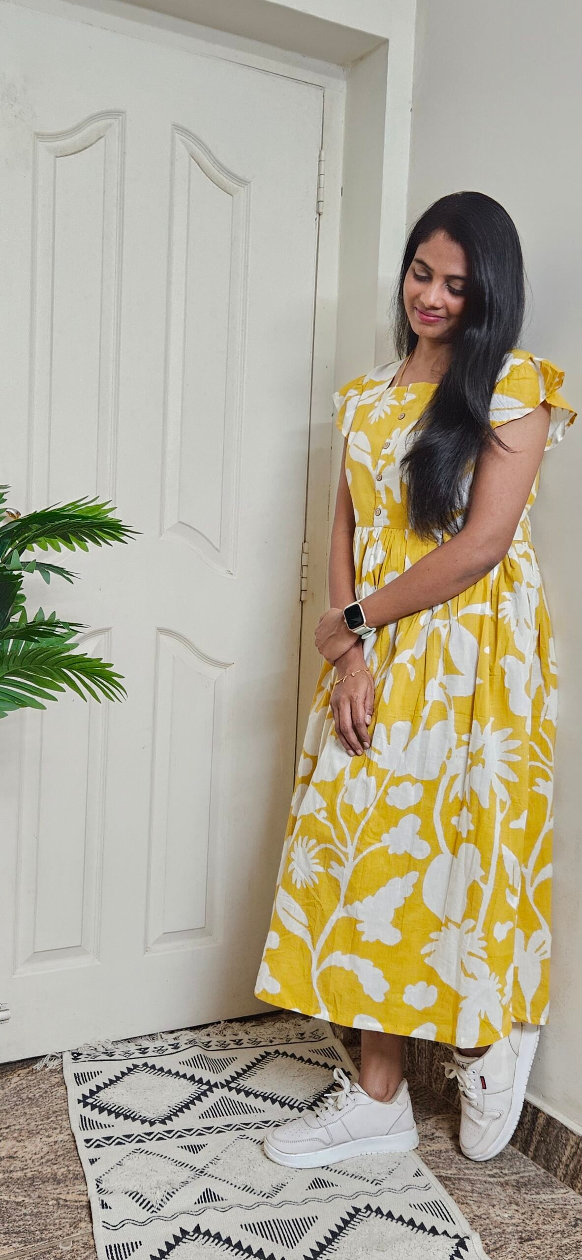Yellow cotton maxi dress with soft butterfly sleeves, elegant chest buttons, and a comfortable cotton lining. Lightweight, breathable, and perfect for an effortless everyday look 💛